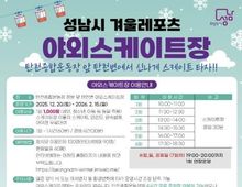 (케이엠뉴스) 성남시는 분당구 야탑동 탄천변에 야외 스케이트장을, 중원구 성남동 성남종합운동장 야외 주차장에 썰매장을 각각 조성해 오는 12월 20일 문을 연다. 스케이트장은 이날 오후 1시, 썰매장은 오후 3시 개장식 이후 운영을 시작한다. 개장식 당일 스케이트장은 피겨 스케이팅 댄싱, 썰매장에선 팝페라 등의 축하 공연이 열리고, 두 곳 모두 스티커 타투싱, 풍선아트 체험 부스가 운영된다. 이용료는 스케이트, 썰매, 안전모 등 장비 대여료를 포함해 회당 1000원이다. 야탑동 탄천변 스케이트장은 4000㎡ 규모로 조성됐다. 일반용 링크(길이 58m×폭 16m)와 민속 썰매 링크(길이 38m×폭 16m)를 갖췄다. 스케이트를 처음 배우는 이들 위해 펭귄 등 동물 모양의 보조 기구를 빌려준다. 성남종합운동장 썰매장은 10개 레인의 슬로프(폭 28m×길이 55m)를 갖췄다. 경사진 얼음판을 튜브를 타고 내려오는 아이스 튜브 슬라이드 방식이다. 두 곳 레포츠 시설엔 양호실과 매점, 푸드트럭, 화장실 등의 편의시설이 있고, 안전요원(총 50명)이 곳곳에 배