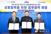 (케이엠뉴스) 파주시가 최첨단 스포츠문화도시 조성을 위한 핵심 기반시설 구축에 의미 있는 첫걸음을 내디뎠다. 시는 지난 4일 박정 국회의원 및 대우건설과 함께 '파주 돔구장 및 스포츠 융복합시설 조성'과 관련한 상호협력 업무협약(MOU)을 체결했다. 이번 협약은 향후 돔구장 및 스포츠 융복합시설 조성 사업 구상 과정에서 필요한 기술적 자문과 정보교류 체계를 마련하기 위한 것으로 ▲스포츠·문화 복합시설 개발 관련 동향 및 정책 공유 ▲사업화 방안 검토를 위한 기술적 자문 및 정보교류 ▲사업 추진 단계에서 발생할 수 있는 위험 요소 자문 등 실무협력을 위한 구체적인 방안들이 모두 망라됐다. 각 협약 당사자의 역할 분담도 구체화했다. 파주시는 행정 절차상 제공 가능한 공공정보(데이터)를 공유하고, 박정 국회의원은 정부 정책 및 제도 관련 동향 정보를 제공하며, 대우건설은 대규모 복합시설 시공 경험을 바탕으로 민간 기술 자문 역할을 맡는다. 파주시는 수도권광역급행철도(GTX)-에이(A) 노선, 경의중앙선 등 광역 철도망과 서울~문산간고속도로, 수도권제2순환고속도로 등 광역도로가 연결된 경기 북부의 대표적인