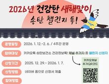 (케이엠뉴스) 평택시 송탄보건소는 12월 29일부터 2026년 1월 7일까지 건강한 새해맞이 ‘송탄 챌린지 톡!’1차 참여자를 모집한다고 밝혔다. ‘송탄 챌린지 톡!’은 챌린지 신청자를 대상으로 4주간 운동 미션을 제공하고 운동 인증을 통해 건강한 생활 습관을 형성하는 것을 목표로 진행되는 프로그램이다. 챌린지는 4주 동안 주 2회, 총 8개의 걸음 수, 스쿼트 챌린지 등의 유산소+근력운동 미션이 제공되며, 참여자는 제공되는 운동 미션을 실천 후 1:1 채팅방으로 인증사진을 보내면 된다. 챌린지 종료 후에는 8회 미션 중 5회 이상 미션을 인증한 참여자를 대상으로 100명을 추첨해 인센티브(여행용 파우치)도 지급할 예정이다. 챌린지 참여 신청은 네이버 폼을 활용하며, 미션을 받아보기 위해 송탄보건소 건강정보톡! 채널도 필수로 추가해야 한다. 채널 추가 방법은 누리집 혹은 정보무늬(QR코드) 촬영이나 검색을 활용하면 된다. 보건소 관계자는 “혼자 운동하기 귀찮고 막막하게 느껴지는 분들도 쉽게 참여할 수 있도록 카카오톡을 활용한 모바일 프로그램을 준비했다”며, “재미있고 가볍게 시작해 건강