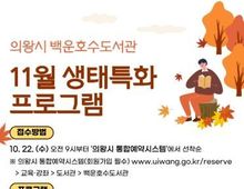 (케이엠뉴스) 의왕시 백운호수도서관은 지역 주민들에게 자연과 생태의 소중함을 알리고 책을 통해 환경 감수성을 높이기 위해 '11월 생태특화 프로그램'을 운영한다고 밝혔다. 이번 생태특화 행사는 ▲ 어린이 마술 공연 '환경지킴이 초록술사' (2017년 ~ 2021년생 어린이 및 보호자) ▲ 저자초청강연 '신비로운 공룡의 세계'(초등학생) ▲ 저자초청강연 '나는 미생물과 산다'(성인 및 청소년) 총 3개 프로그램으로, 전 연령이 참여할 수 있도록 구성돼 있다. 신청은 10월 22일부터 의왕시 통합예약시스템에서 선착순으로 진행되며, 참가비는 전액 무료다. 시 관계자는“책과 자연을 매개로 한 생태특화프로그램이 지역 주민들에게 생태적 삶에 대한 관심을 높이고, 백운호수도서관이 생태 문화 확산의 거점으로 자리매김하게 하는 계기가 되길 기대한다”라고 말했다.
