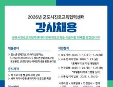 (케이엠뉴스) (재)군포시청소년재단 군포시진로교육협력센터는 관내 청소년의 진로 탐색과 진로 역량 강화를 위해 '2026년 군포시진로교육협력센터 강사'를 채용한다고 밝혔다. 이번 강사 채용은 2026년 한 해 동안 군포시 관내 초·중·고등학생을 대상으로 진로·직업 관련 교육 프로그램을 운영할 전문 강사를 선발하기 위한 것으로, 총 7개 분야에서 44명 내외를 모집할 예정이다. 채용 공고는 2026년 1월 5일부터 1월 13일까지 진행되며, 지원서 접수는 1월 14일부터 1월 20일까지이다. 접수는 이메일을 통해서만 가능하다. 채용된 강사는 계약일로부터 2026년 12월 31일까지 활동하게 되며, 강사료는 2025년 지방자치인재개발원 강사수당 기준에 따라 지급된다. 군포시진로교육협력센터 이혜진 센터장은 “이번 강사 공개 모집을 통해 투명하고 공정한 절차에 따라 다양한 분야의 전문 강사를 확보하여, 학생들의 진로 이해와 자기 탐색을 돕는 질 높은 진로교육을 제공할 계획”이라며 “진로교육에 관심 있는 분들의 많은 지원을 기대한다”고 밝혔다.