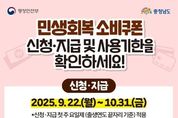 (케이엠뉴스) 2차 민생회복 소비쿠폰의 신청 기한이 오는 31일 마감되는 가운데, 충남도가 도내 미신청자에 대해 기한 내 신청·사용할 것을 당부했다. 신청 마감일은 31일 오후 6시로, 기한 내 신청해야 10만 원을 지원받을 수 있다. 민생회복 소비쿠폰은 지역경제에 신속히 활력을 불어넣기 위해 사용기한이 명확히 설정돼 있다. 사용기한은 이미 지급된 1차분과 2차분 모두 다음달 30일까지다. 온오프라인으로 받은 카드 포인트는 기한 내 사용해야 하며, 기한이 지나면 잔액은 자동 소멸한다. 종이형 상품권도 기한이 지나면 사용이 불가하다. 소비쿠폰 통계 시스템 자료에 의하면 도내 1차 온라인 지급분 기준 3280억 원 중 2.5%인 83억여 원이 아직 사용되지 않은 것으로 나타났다. 도의 2차 소비쿠폰 지급률은 24일 기준 96%로, 지급 대상자 중 7만여 명의 도민이 아직 받지 않은 것으로 집계됐다. 도 관계자는 “민생회복 소비쿠폰은 국민의 가계 부담을 덜고 지역경제를 회복하기 위한 실질적 민생 지원 정책”이라며 “신청 마감일은 10월 31일, 사용기한은