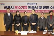 (케이엠뉴스) 군포시는 17일 시청 3층 중회의실에서 ‘2025년 군포시 우수기업 인증서 및 현판 수여식’을 열고 5개 우수기업에 인증서와 현판을 수여했다. ‘우수기업 선정사업’은 2022년부터 시작하여 올해 4번째로 추진하는 사업으로 일자리 창출, 세수 증대 등 지역경제 활성화에 기여한 기업을 선정하여 인센티브를 부여하는 사업이다. 선정된 우수기업은 인증기간(3년) 동안 군포시 중소기업 육성자금 지원 시 추가 이차보전, 군포시 관내 공영주차장 이용 시 주차요금 감면, 협약병원 의료비 지원 등의 인센티브가 부여된다. 하은호 군포시장은 “어려운 경제 상황 속 관내 우수한 기업에 활력을 불어넣기 위한 우수기업 선정사업에 관심 가져주심에 감사드리며, 앞으로도 기업지원 사업을 다각화하여 기업 경영하기 좋은 환경을 만들겠다”고 말했다. 올해 선정된 군포시 우수기업은 △(주)아이씨에이치 △㈜지비티코리아 △주식회사예선테크 △듀라텍 주식회사 △㈜트리플닷 으로 총 5개 기업이다.