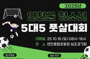 (케이엠뉴스) (재)연천군청소년육성재단(청소년수련관)은 관내 거주·재학 및 관내 축구 클럽 소속 유치원생, 초·중학생 대상으로 연천종합운동장 보조경기장(연천군청소년수련관 옆)에서 “2025년 연천군 청소년 풋살대회”를 10월 18일(토) 개최한다고 밝혔다. 연천군 거주 또는 재학, 연천군 축구 클럽 소속인 유치원생·초등학생·중학생 대상으로 유치부 1개부, 초등부 3개부(1~2학년, 3~4학년, 5~6학년), 중등부 1개부 총 5개부로 진행하며, 각 8팀씩 총 40개팀을 선착순으로 모집한다. 모집기간은 9월 8일부터 9월 22일까지이며 참가비는 무료이다. 신청서 제출방법과 세부 대회 안내는 (재)연천군청소년육성재단 홈페이지 공지사항에 게시되어 있다. 우승팀에게는 트로피·메달 및 상금을 수여하며, 본 경기뿐만 아니라 경기를 보러 온 모든 분들이 함께 참여할 수 있는 이벤트도 진행할 예정이다. (재)연천군청소년육성재단 관계자는 “연천군 청소년 풋살대회가 청소년들의 체력증진과 공정한 스포츠정신, 팀워크, 성취감 등을 배울 수 있는 기회가 될 수 있도록 철저하게 대회를 준비하겠다.”고 말했다.