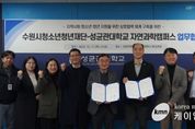 (케이엠뉴스) 수원시청소년청년재단은 11일 성균관대학교 자연과학캠퍼스와 청소년ㆍ청년의 취‧창업 지원과 전인적 성장을 위한 업무협약(MOU)을 체결했다고 밝혔다. 이번 협약을 통해 양 기관은 △대학생 연계사업 활성화를 위한 지속적인 교류활동 추진 및 내실화 △청소년의 진로 탐색을 위한 멘토링 및 학과 탐방 기회 제공 △기타 상호 협력이 필요하다고 인정되는 분야에서의 협조 체계를 구축할 예정이다. 재단 관계자는 "이번 협약이 단순한 형식적 절차에 머무르지 않고 우리 청소년‧청년들에게 새로운 경험과 지속적인 성장의 기회를 제공하는 중요한 출발점이 되기를 희망한다"며, "협약의 성공적인 이행을 위해 상호 긴밀하게 협력해 나갈 것"이라고 밝혔다.