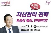 (케이엠뉴스) 성남시는 오는 12월 9일 오후 3시 30분~5시 30분 시청 1층 온누리에서 ‘자산관리 전략’을 주제로 한 올해 희망성남 토크콘서트 마지막 강연을 연다. 앞선 11월 19일 ‘부동산 전망과 내 집 마련 전략(고종완 한국자산관리연구원장)’에 이은 경제 특강 2탄이다. 이날(12.9) 초빙 강사는 김광석 한국경제산업연구원 경제연구실장이다. 강연자는 ‘유동성 랠리’와 빠르게 변화하는 경제 환경 속에서 국내외 주요 경제 현안에 대해 알기 쉽게 설명한다. 이와 함께 유동성 장세의 지속 여부, 실질적인 투자 운용 방향, 향후 경제전망, 자산관리 전략에 관한 강연을 한다. 김광석 실장은 ‘경제 읽어주는 남자’ 저자로 알려진 경제전문가다. 현재 한양대학교 겸임교수로도 재직 중이며, 에너지경제연구원 전문연구원, 현대경제연구원 선임연구원, 삼정KPMG 경제연구원 수석연구원 등으로 활동했다. 강연은 무료로 진행되며, 성남시 평생학습 통합 플랫폼 ‘배움 숲’ 홈페이지를 통해 선착순 600명까지 신청할 수 있다.