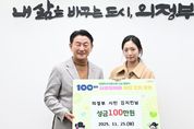 (케이엠뉴스) 의정부시는 11월 25일 시민 김지민 씨가 ‘100일간 사랑릴레이 배턴 잇기’에 동참해 성금 100만 원을 기부했다고 밝혔다. 김지민 씨는 “기부는 멀리 있는 것이 아니라 내가 할 수 있는 작은 실천에서 시작된다”며 “약소한 금액이지만 주변 어려운 이웃에게 전달돼 많은 도움이 됐으면 좋겠다”고 전했다. 김동근 시장은 “어려운 경제 상황 속에서도 따뜻한 나눔을 실천해 주신 김지민님께 감사드린다”며 “요즘같이 경제가 어려운 시기에 직접 땀을 흘려 번 돈을 이웃을 위해 기부하는 활동은 지역사회에 희망과 온기를 더해줄 것”이라고 말했다. 시는 지난 11월 5일부터 2026년 2월 12일까지 ‘100일간 사랑릴레이 배턴 잇기’ 모금 운동을 진행하고 있으며, 모금된 현금과 현물은 공동모금회와 연계해 의정부시 저소득층에게 지원하고 있다.