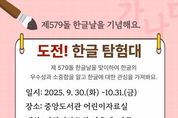 (케이엠뉴스) 인천광역시교육청중앙도서관은 제579돌 한글날을 맞아 9월 30일부터 10월 31일까지 어린이들이 즐겁게 한글을 배우고 도서관을 체험할 수 있는 특별행사 ‘도전! 한글 탐험대!’를 운영한다. 이번 행사는 어린이자료실에서 진행하며, 어린이들이 비치된 문제지를 풀며 한글의 독창성과 우수성을 체험할 수 있도록 준비했다. 문제는 어린이 눈높이에 맞춰 쉽고 재미있게 구성했으며, 3문제 이상을 맞히면 소정의 기념품을 받을 수 있다. 자세한 사항은 중앙도서관 누리집 또는 어린이자료실로 문의하면 된다.