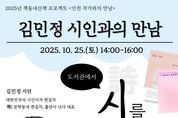 (케이엠뉴스) 인천광역시교육청계양도서관은 10월 25일 오후 2시 ‘책동네산책 프로젝트’의 일환으로 ‘김민정 시인과의 만남’을 개최한다. ‘도서관에서 시를 줍다’를 주제로 열리는 이번 프로그램에서 김민정 시인은 작품 세계와 시에 관한 다양한 이야기를 독자들과 나누며 문학적 공감을 형성할 예정이다. 김민정 시인은 1999년 『문예중앙』으로 등단해 시집 《날으는 고슴도치 아가씨》, 《아름답고 쓸모없기를》, 산문집 《각설하고,》, 《읽을, 거리》 등을 펴냈으며, 출판사 난다 대표와 ‘문학동네 시인선’ 편집자로서 활발한 활동을 이어오고 있다. 참여 신청은 10월 1일 오전 10시부터 계양도서관 누리집에서 선착순 가능하며, 자세한 사항은 누리집 공지사항을 확인하거나 독서문화과로 문의하면 된다.