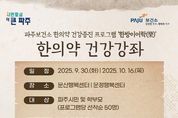 (케이엠뉴스) 파주보건소는 시민들의 건강한 생활을 돕고 한의약에 대한 올바른 이해를 돕기 위해 ‘한의약 건강강좌’를 개최한다. 이번 강좌는 오는 9월과 10월 두 차례에 걸쳐 문산행복센터와 운정행복센터에서 진행된다. 첫 번째 강좌는 9월 30일 10시 문산행복센터 소공연장에서 열린다. ‘성장 한의약 교육’을 주제로, 김지훈 한방공중보건의와 동국대학교 일산한방병원 심영신 한의사가 강연에 나서 학부모와 시민들에게 성장 발달에 도움이 되는 한의약적 관리 방법을 소개한다. 두 번째 강좌는 10월 16일 13시 30분 운정행복센터 다목적홀에서 개최된다. ‘한방으로 건강한 겨울나기’를 주제로, 권해진 래소한의원 한의사가 강연하며, 환절기 면역력 강화와 겨울철 건강 관리에 유용한 한의약 정보를 전달할 예정이다. 이번 강좌는 파주시민 각 50명을 대상으로 포스터 내 정보 무늬(QR코드)를 통해 신청 가능하며, 강좌를 통해 생활 속에서 실천할 수 있는 한의약적 건강관리 방법을 배우는 기회가 될 것으로 기대된다. 이한상 파주보건소장은 “시민들이 쉽게 접근할 수 있는 한의약 강좌를 통해 건강에 대한 관심과