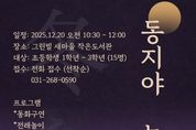 (케이엠뉴스) 수원시 장안구 정자3동 그린빌새마을문고는 동지를 맞아 오는 20일 전통문화 등 다양한 프로그램을 체험할 수 있는 ‘동지야 놀자’ 행사를 개최한다고 밝혔다. 이번 행사는 오는 20일 오전 10시 30분부터 12시까지 도서관에서 진행되며, △동화구연 △작은음악회 △전래놀이 △팥죽나눔 등 다양한 프로그램이 마련됐다. 박혜경 그린빌새마을문고회장은 “이번 행사를 통해 우리 고유의 세시풍속을 자연스럽게 익히고 따뜻한 겨울 정을 느낄 수 있길 바란다”며 “앞으로도 지역 주민과 함께하는 작은도서관이 될 수 있도록 노력하겠다”고 말했다.