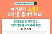 (케이엠뉴스) 인천광역시교육청연수도서관은 9월 23일부터 3주간 ‘2026년 장서 구성 및 연속간행물 구독 계획 수립’을 위한 설문조사를 진행한다. 이번 조사는 2026년도 장서 구입과 자료 서비스 개선, 연속간행물 구독 목록 선정에 활용될 예정이며, 연수도서관을 이용하거나 관심 있는 시민이라면 누구나 참여할 수 있다. 종합·어린이·디지털자료실 현장 또는 연수도서관 누리집에서 참여 가능하며, 도서관을 직접 찾아 설문에 참여한 시민들에게는 소정의 기념품도 제공한다. 연수도서관 관계자는 “시민과 함께 도서관을 만들어가며 수요자 맞춤형 장서 구성으로‘미래를 열어가는 행복한 도서관’을 실천하겠다”며 적극적인 참여를 당부했다. 자세한 사항은 연수도서관 정보자료과로 문의하면 된다.