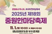 (케이엠뉴스) ‘제18회 중원한마당축제’가 오는 11월 1일 오전 10시부터 오후 2시 30분까지 2000여 명이 참석한 가운데 성남종합운동장 보조경기장에서 열린다. 성남시 중원구가 후원하고, 중원한마당축제 추진위원회가 주최·주관해 열리는 이번 행사는 ‘중원에서 하나로, 모두의 한마당 축제’를 주제로 진행된다. 이날 특설무대에선 11개 동 주민 대표가 출연해 넘치는 끼와 노래 실력을 선보이는 ‘우리 동네 인기스타’ 공연이 펼쳐진다. 초청 가수 윤수현의 ‘천태만상’ 등 트로트 공연, 신인 아이돌 걸그룹 아스텔의 ‘슈퍼노바’, ‘아일랜드’ 등의 공연, 중원유스센터 청소년 보컬 동아리와 댄스 동아리 공연도 열려 축제 분위기를 달군다. 시민 체험 행사도 다양하다. 행사장 곳곳에 총 11개 체험 부스를 설치해 4차산업과 관련한 드론 축구, 가상현실(VR) 트럭 체험, 배틀 로봇 등과 페이스페인팅, 목공 체험 등을 해볼 수 있다. 중원구 관계자는 “주민 간 화합을 도모하고, 신나고 활기찬 지역 분위기를 조성하는 장이 될 것”이라고 말했다.