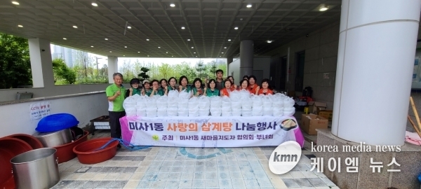 (케이엠뉴스) 미사1동 새마을지도자와 부녀회는 지난 14일 미사1동 행정복지센터에서“사랑의 삼계탕 나눔행사”를 가졌다.
