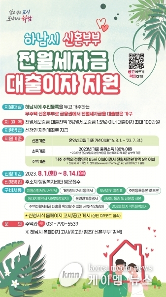 (케이엠뉴스) 하남시가 다음 달 1일부터 14일까지 제2차 신혼부부 전월세자금 대출이자 지원 대상자 모집을 통해 무주택 신혼부부에게 최대 100만원의 전월세자금 대출이자를 지원한다.