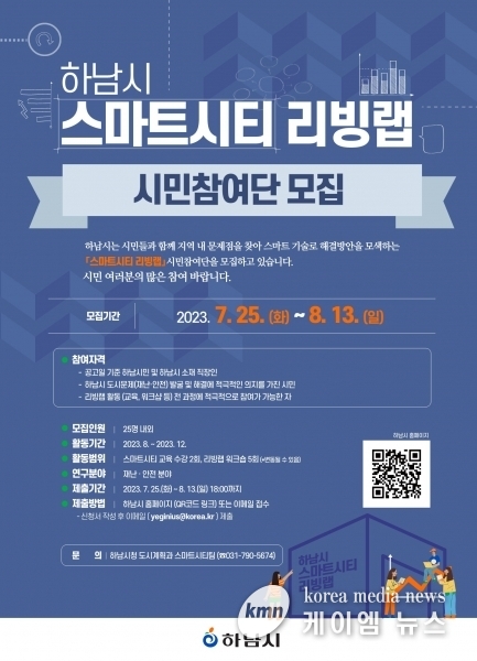 (케이엠뉴스) 하남시는 오는 8월 13일까지 ‘스마트시티 리빙랩’ 시민참여단 25명을 모집한다고 25일 밝혔다.