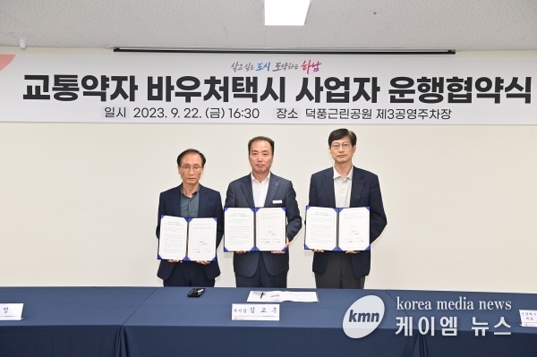 27일 시에 따르면 지난 22일 덕풍근린공원 제3공영주차장 택시 쉼터에서 개인택시운송사업조합 하남시지부 및 신장택시와 ‘바우처택시 운행을 위한 협약식’을 열고 지역 내 교통약자들의 이동 편의 증진 및 교통복지 실현을 위한 업무 협약을 체결했다.