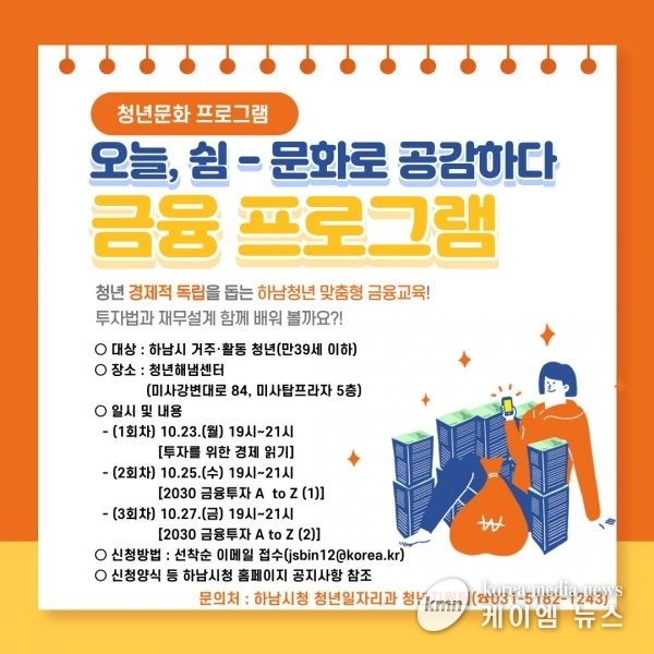 (케이엠뉴스) 하남시가 만39세 이하 청년을 대상으로 금융역량 강화와 경제적 독립을 지원하기 위해 청년 맞춤형 금융교육을 실시한다.