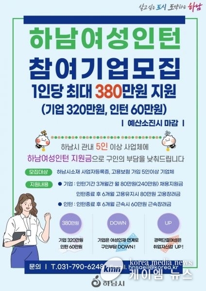 11일 시에 따르면 이번 사업은 하남시가 현주소인 구직자·미취업 여성과 상시 근로자 5인 이상의 지역 내 기업을 지원하며 일자리 안착과 장기 고용 유지를 위해 인턴에게 60만원, 기업에 320만원을 지원한다.