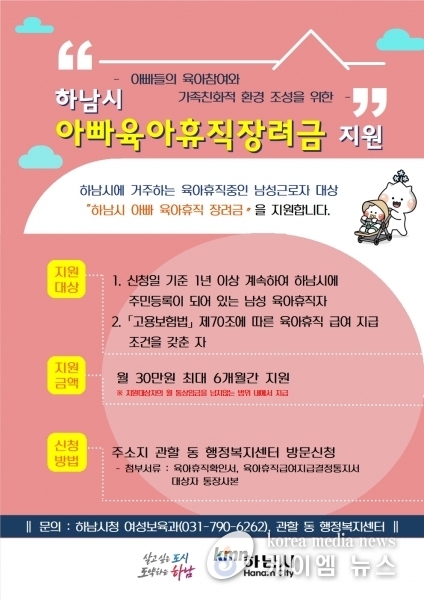 (케이엠뉴스) 하남시가 ‘아빠 육아휴직 장려금’을 최대 180만원까지 지원한다고 16일 밝혔다.