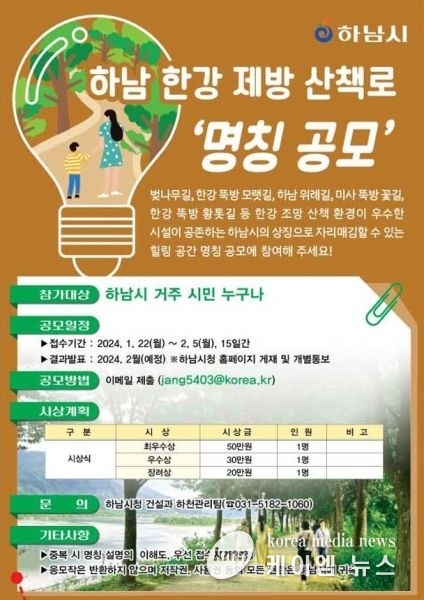 (케이엠뉴스) 하남시가 한강 제방 산책로의 명칭을 공모한다.