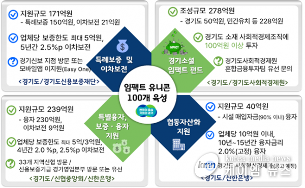 (케이엠뉴스) 경기도가 2026년까지 연간 매출 100억원 이상 또는 기업가치 500억원 이상인 사회적경제기업을 말하는 ‘임팩트 유니콘’ 100개를 육성하겠다고 밝힌 가운데 올해 육성 사업의 하나로 총 550억원 규모의 금융지원 사업 4개를 추진한다.