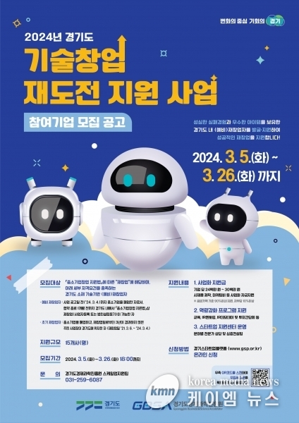 (케이엠뉴스) 경기도와 경기도경제과학진흥원이 재창업 새싹기업을 위해 역량 강화부터 사업화 자금까지 원스톱 맞춤형 지원하는 ‘2024년 경기도 기술창업 재도전 지원사업’ 사업에 참여할 예비·초기 재창업자를 26일까지 모집한다.