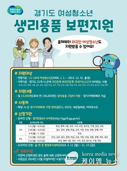(케이엠뉴스) 경기도가 여성청소년에게 월 1만 3천 원의 생리용품 구입비를 지원하는 ‘여성청소년 생리용품 보편지원 사업’의 접수를 11일부터 시작한다.