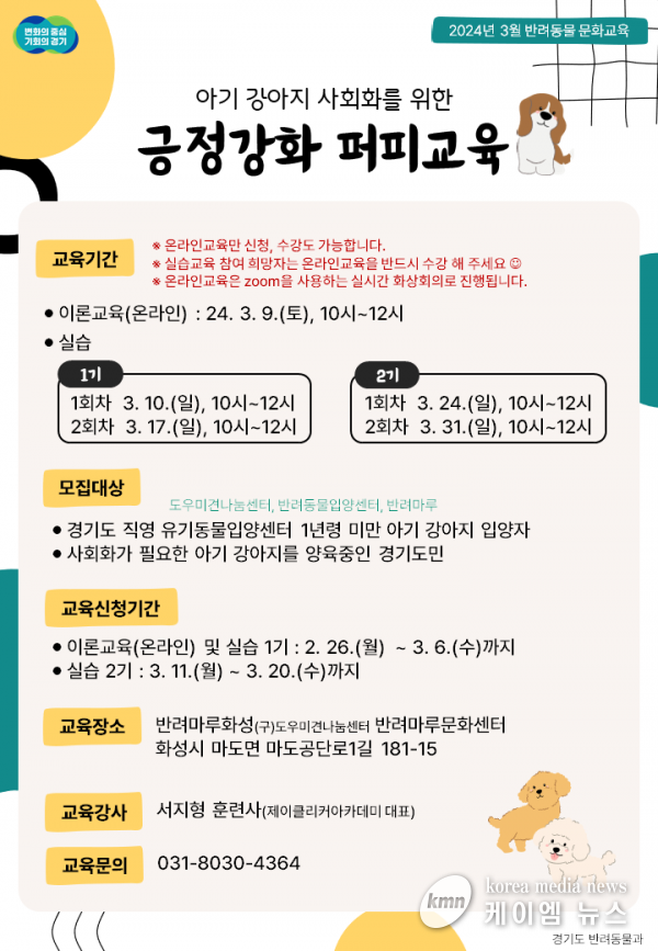 (케이엠뉴스) 경기도가 1년령 미만 어린 강아지를 키우는 보호자를 대상으로 ‘아기 강아지 사회화교육’을 한다.