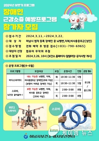 (케이엠뉴스) 하남시가 미사보건센터에서 장애인의 근감소증 예방과 삶의 질 향상을 위해 뇌병변, 지체, 비사용증후군 장애인을 대상으로 근감소증 예방 프로그램을 운영한다.