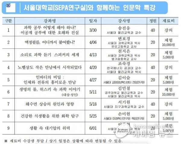 이현재 시장은 “서울대의 우수한 교육 인프라를 활용해 인문학적 소양과 창의·융합교육 역량을 높일 기회를 제공해드리고자 이번 특강을 준비하게 됐다”며 “가족 단위로 참여할 수 있도록 주말에 강좌를 개설한 만큼 수강신청을 통해 가족이 함께 봄나들이를 겸해 참석하실 것을 추천해 드린다”고 말했다.