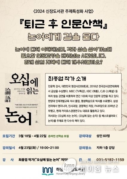 (케이엠뉴스) 하남시는 직장인을 대상으로 진행되는 야간 인문학 강연인 ‘퇴근 후 인문산책’ 참여자를 오는 18일부터 모집한다고 밝혔다.
