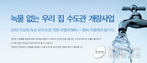 시 관계자는 “급수관 노후 문제로 불편을 겪는 시민들을 돕기 위해 녹슨 상수도 개량공사비 지원사업 실시하게 됐다”며 “우리시는 더 맑고 깨끗한 수돗물이 각 가정에 공급될 수 있도록 최선을 다하겠다”고 강조했다.