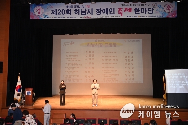 (케이엠뉴스) 이현재 하남시장이 19일 하남문화예술회관 아랑홀에서 진행된 ‘제44회 장애인의 날 기념행사’에서 “하남시는 장애인과 비장애인이 동등하게 행복한 삶을 누리는 환경을 조성하도록 노력하겠다”고 밝혔다.