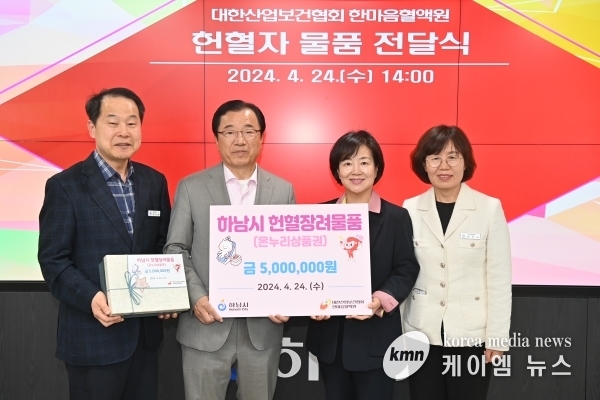 (케이엠뉴스) 하남시가 24일 시청 본관 시장실에서 ‘2024년 헌혈자 지원 물품 전달식’을 열고 대한산업보건협회 한마음혈액원에 온누리상품권 1만원권 500장을 기증했다.