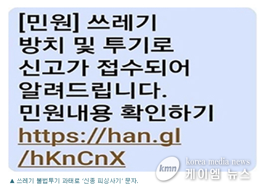 (케이엠뉴스) 하남시가 마치 공공기관이 보낸 쓰레기 불법투기 과태료 안내 문자메시지인 것처럼 위장해 링크 접속을 유도하는 ‘신종피싱 사기 문자’에 대해 각별한 주의를 당부했다.