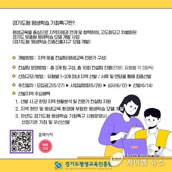 (케이엠뉴스) 경기도평생교육진흥원이 지역 평생교육 활성화를 위한 ‘경기도형 평생학습 기회특구 모델 개발 컨설팅’에 참여할 시·군을 6월 10일까지 모집한다.
