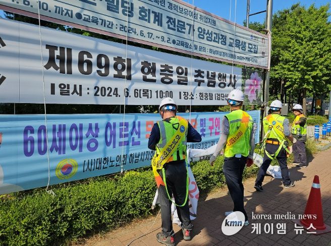 5일 하남시에 따르면 시는 지난 4일 옥외광고물 민간위탁 단체인 하남시 옥외광고협회와 함께 현수막 지정 게시대의 로프 노후도와 지지구조물의 변형 여부, 볼트 용접 접합부 확인 등 옥외광고물의 위험 요소를 전반적으로 점검했다.