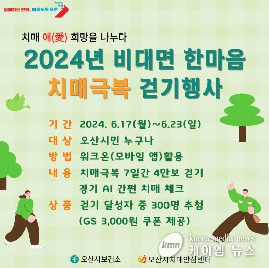(케이엠뉴스) 오산시 치매안심센터는 지역주민의 치매 인식개선과 걷기 실천을 통한 치매 예방을 위해 이달 17일부터 23일까지 '한마음 치매극복 걷기행사: 치매 애(愛) 희망을 나누다'를 개최한다고 밝혔다.