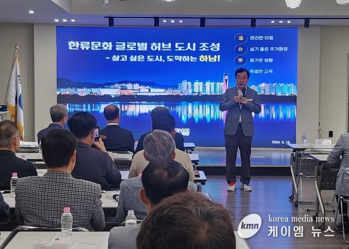 (케이엠뉴스) 이현재 하남시장이 지난 18일 ㈔하남시기업인협의회가 주관하는 조찬 포럼에서 하남시의 K-컬처 허브도시 조성 비전에 발맞춘 기업의 미래 전략 방안을 제안해 박수갈채를 받았다.
