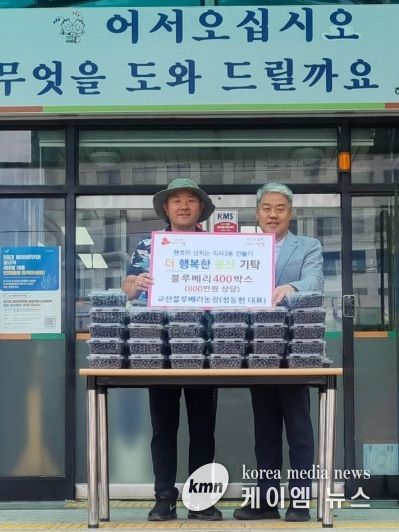 (케이엠뉴스) 하남시 교산동 소재 교산블루베리 농장 정동헌 대표는 6월 27일 미사3동행정복지센터를 방문해 관내 저소득층에게 전달해달라며 블루베리400박스(800만원 상당)를 기탁했다.