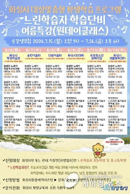 (케이엠뉴스) 화성시가 15일부터 오는 26일까지 ‘느린학습자 학습단비’ 여름특강(원데이클래스) 수강생을 선착순 모집한다.