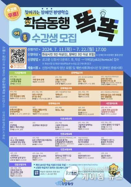 (케이엠뉴스) 화성시가 오는 22일까지 찾아가는 장애인 평생학습 ‘학습동행 똑똑’ 1기 수강생을 모집한다.