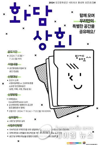 7월 10일 ~ 7월 22일 기간 동안 오산시 소재 민간문화공간을 대상으로 참여자를 모집하고 있으며, 지원 규모는 공간별 최대 3백6십만원, 총 10개소 내외 공간을 서류 및 인터뷰 과정을 통해 최종 선정할 예정이다.