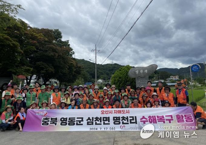 (케이엠뉴스) 오산시는 (사)오산시자원봉사센터에서 17일 최근 기록적인 폭우로 많은 피해가 발생한 자매도시인 영동군으로 수해재난 피해복구 자원봉사 활동을 했다고 밝혔다.
