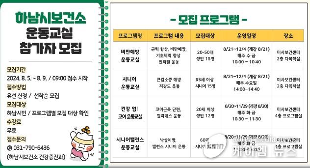 (케이엠뉴스) 하남시는 근력 향상부터 근감소증 예방까지 연령과 신체 특성에 맞춰 최적화된 운동 프로그램에 참여할 수 있는 ‘하남시보건소 운동교실’ 참가자를 오는 8월 5일부터 선착순 모집한다.