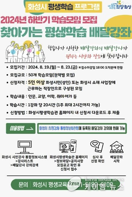 (케이엠뉴스) 화성시는 오는 19일부터 23일까지 화성시 평생학습 프로그램인 ‘찾아가는 평생학습 배달강좌’ 2024년 하반기 학습모임을 권역별로 모집한다.