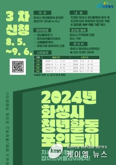 (케이엠뉴스) 화성시가 다음달 6일까지 ‘2024년 청년활동포인트제’ 적립신청 3차 접수를 받는다.