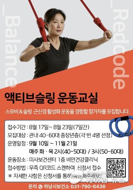 (케이엠뉴스) 하남시는 8월 17일부터 23일까지 근골격계 질환 예방에 도움을 줄 수 있는 ‘액티브슬링 운동교실’에 참여할 중장년층 참가자를 모집한다고 밝혔다.