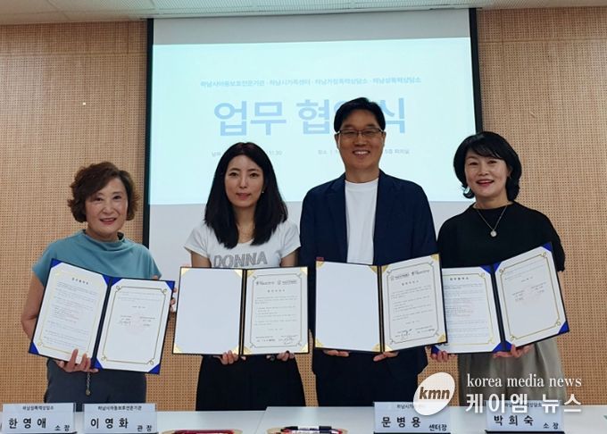 (케이엠뉴스) 학대피해아동 가정의 사례관리와 아동학대 예방 교육·홍보 등의 사업을 수행하고 있는 하남시아동보호전문기관은 지난 8월 12일과 16일 하남시 관내 가족복지를 위한 유관기관인 하남시가족센터, 하남가정폭력상담소, 하남성폭력상담소, 하남시육아종합지원센터와 업무 협약을 체결했다.